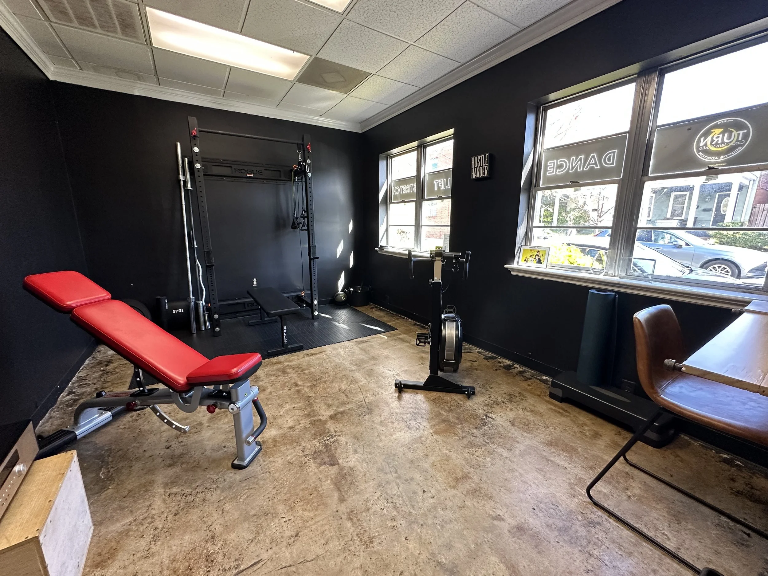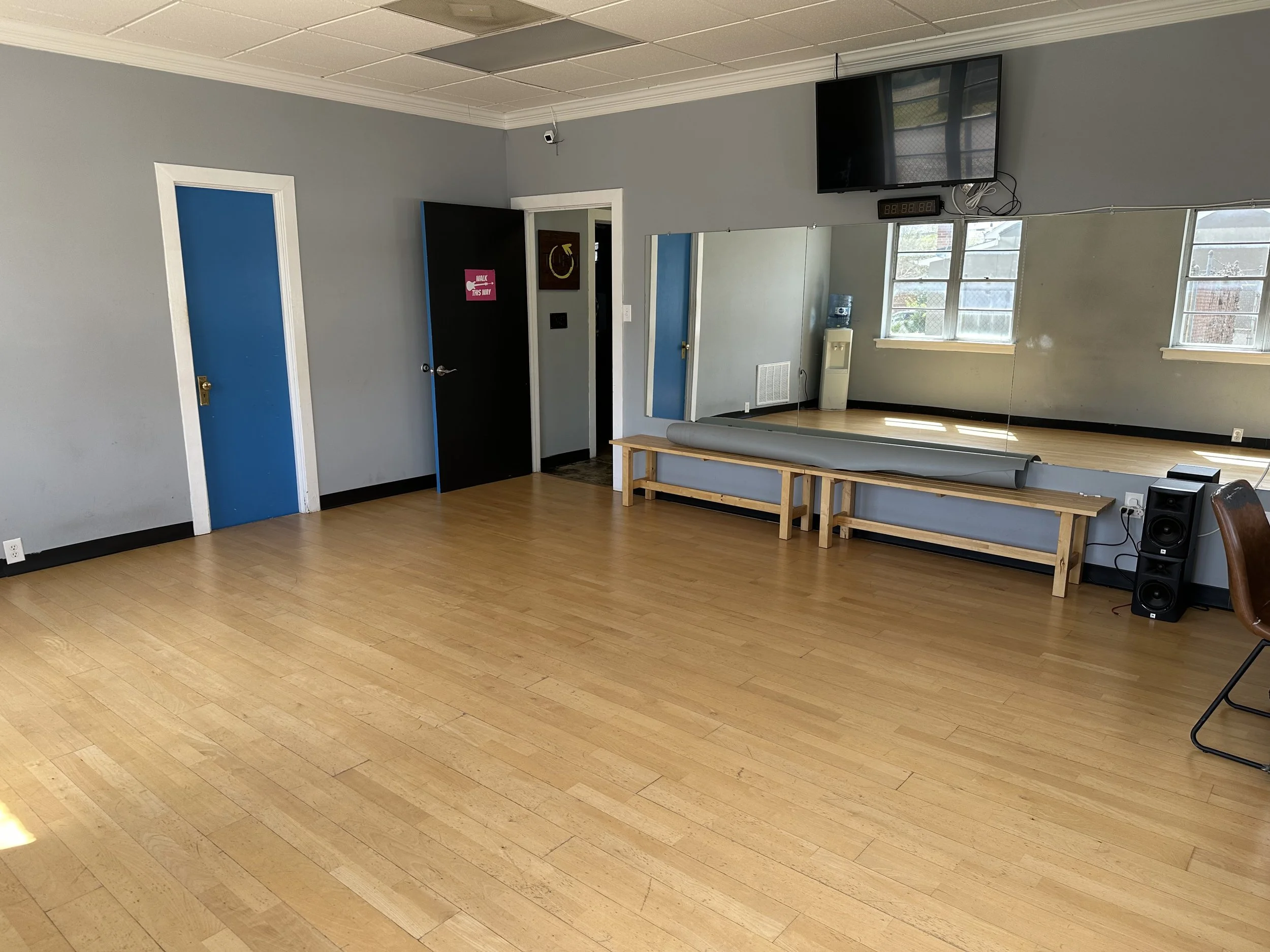 The Turn medium studio is 300sf and is outfitted with a portable sound system, mirrors, wifi, and a flat-screen tv for live streaming/mirroring.